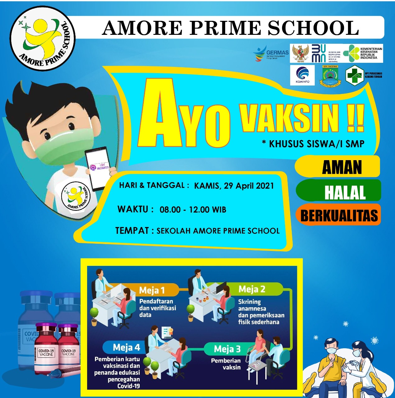 Pada hari Kamis, 29 Juli 2021, Amore Prime School bekerja sama dengan Dinas Kesehatan Kota Tangerang, Puskesmas Karang Tengah, IDI, IBI, dan Kominfo, mengadakan Vaksinasi vaksin Covid-19 untuk pelajar SMP Kota Tangerang. Vaksinasi yang dilakukan di Amore Prime School ini diikuti oleh pelajar SMP dari sejumlah sekolah yang berlokasi di Kota Tangerang di antaranya: